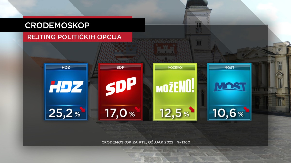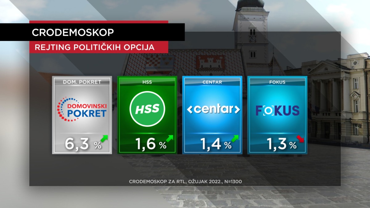 Na dnu ljestvice nalaze se HSS (1,6 posto u ožujku – 1,2 posto u veljači) i Centar (1,4 posto u ožujku – 1,3 posto u veljači), kojima popularnost blago raste, dok Fokusu pada (1,3 posto u ožujku – 1,5 posto u veljači). IDS i HNS kreću se oko odnosno ispod 1 posto (HNS 0,9 posto, koliko je imao i u veljači, a IDS je na 1 posto, koliko je imao i u veljači), dok se broj neodlučnih birača ponešto povećao, sada ih je 16,4 posto.