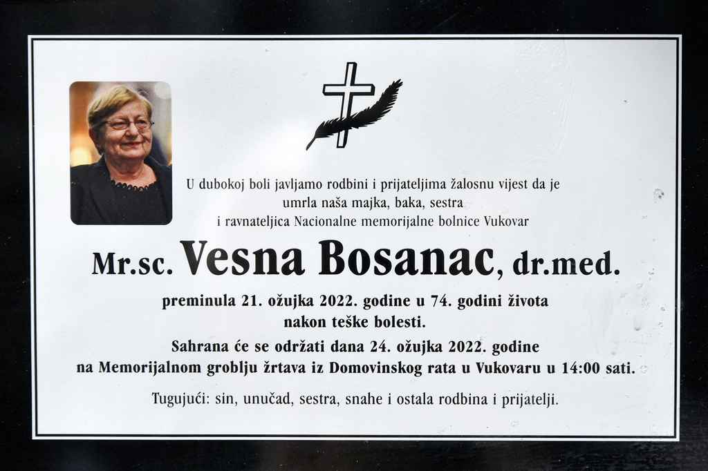 Brojni Vukovarci oprostili su se u četvrtak na Memorijalnom groblju žrtava iz Domovinskog rata od ratne i poslijeratne ravnateljice vukovarske bolnice dr. Vesne Bosanac.