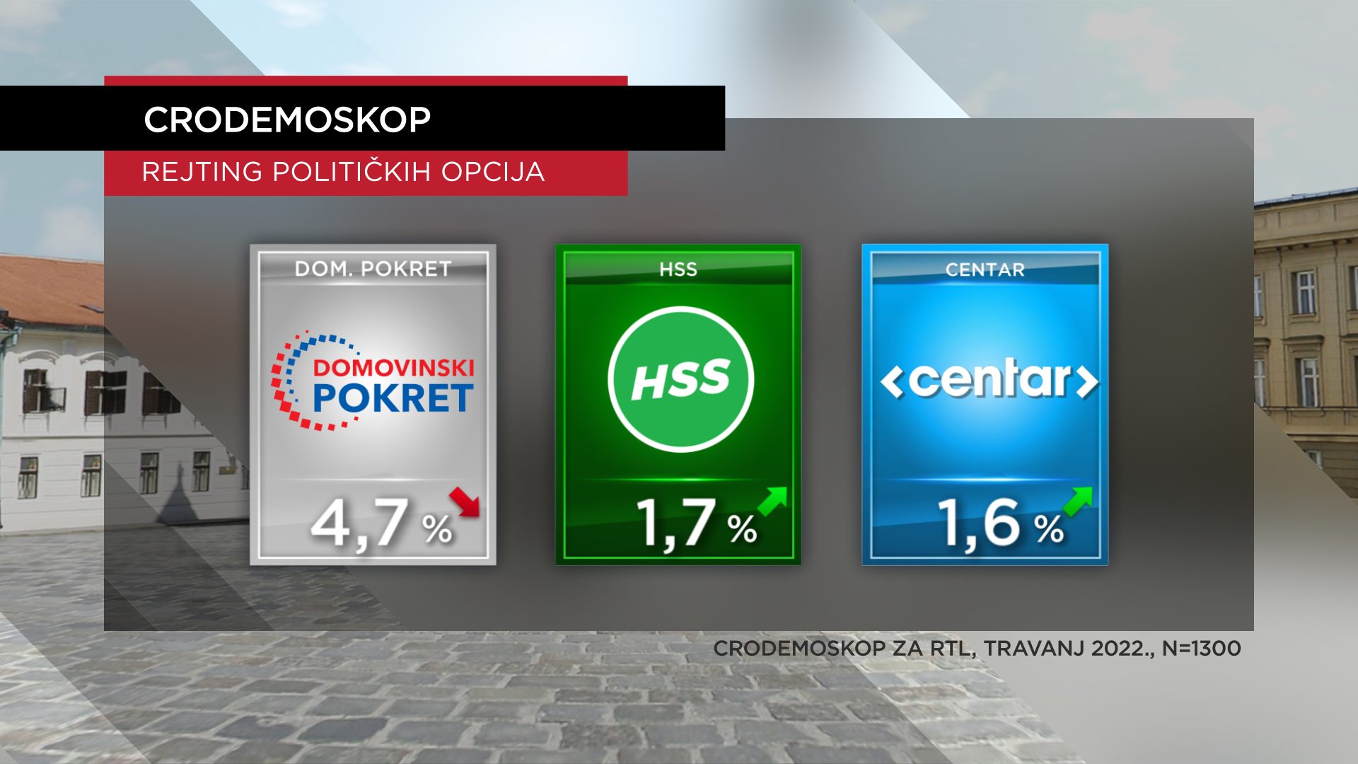 Značajniji pad vidljiv je kod Domovinskog pokreta kojeg vodi vukovarski gradonačelnik, imaju oko 5 posto (imali 6,3 posto u ožujku). Ostali su daleko; HSS niti dva posto (1,7 posto u travnju, imali 1,6 posto u ožujku), CENTAR još niže (1,6 posto u travnju, imali 1,4 posto u ožujku).