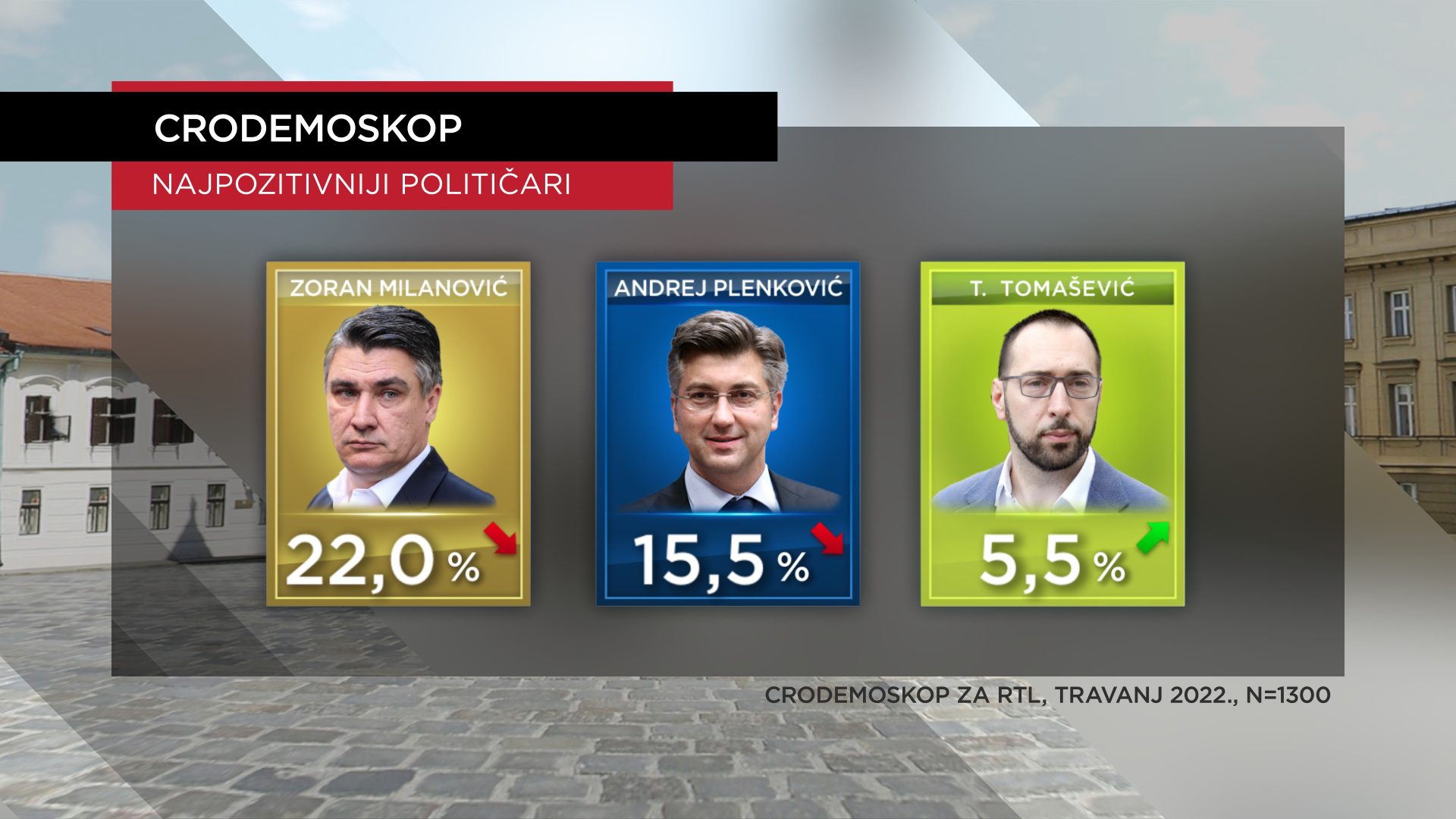 Od ožujka prošle godine predsjednik Milanović je najpozitivniji političar, na toj poziciji je i sada; iako mu rejting pada. 22 posto u travnju ga smatra najpozitivcem (23 posto u ožujku). Rejting pada i njegovu najvećem rivalu premijeru Plenkoviću koji je na 15,5 ali i on je zadržao srebro na ovoj ljestvici (imao 16,1 posto u ožujku). Daleko od vodećeg dvojca u državi, koji doduše jedva razgovaraju, je gradonačelnik Zagreba Tomislav Tomašević s 5,5 posto (imao 4,9 posto u ožujku).