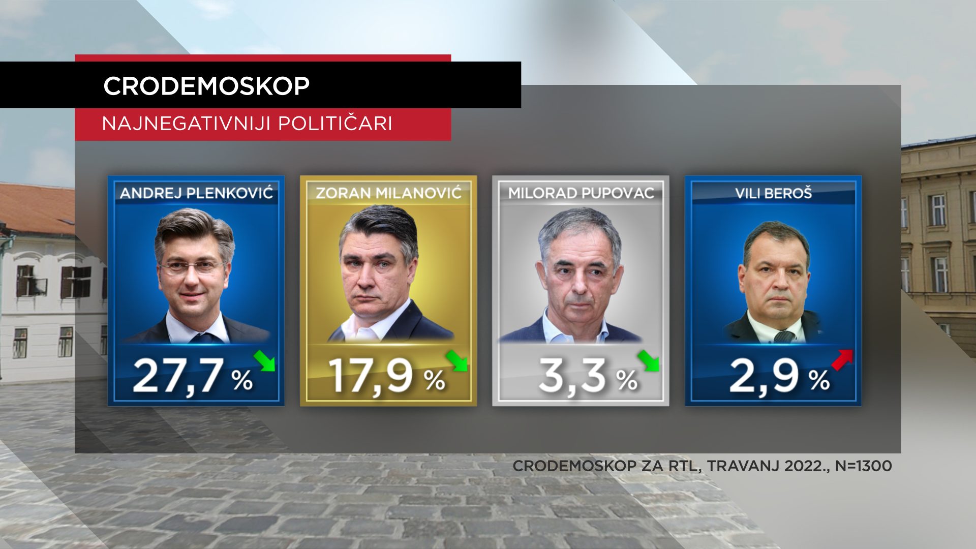 Vrh neprestižne ljestvice drži isti duo, ali obrnutim rasporedom. Prvi izbor i u travnju je premijer Plenković kojeg gotovo 28 posto smatra najnegativnijim političarom (28,5 posto u ožujku). Drugi izbor je predsjednik Republike s gotovo 18 posto (19,5 posto u ožujku). Onda dugo, dugo nitko, pa ponovno Milorad Pupovac (3,3 posto u travnju, 3,7 posto u ožujku), a onda i ministar zdravstva Vili Beroš (2,9 posto u travnju, 0,4 posto u ožujku).