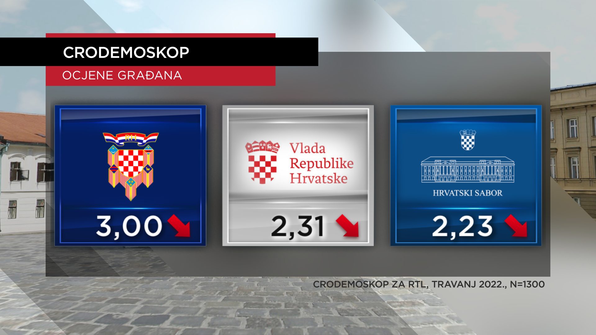 Da su u školi rekli bismo da su svi popustili jer građani, koji političare i biraju, glavnim su institucijama dali nižu prosječnu ocjenu. Pantovčak je na dobar tri (3,03 u ožujku), a Banski dvori i Sabor na dovoljan – dva (Banski dvori 2,34 u ožujku, a Sabor 2,26 u ožujku).