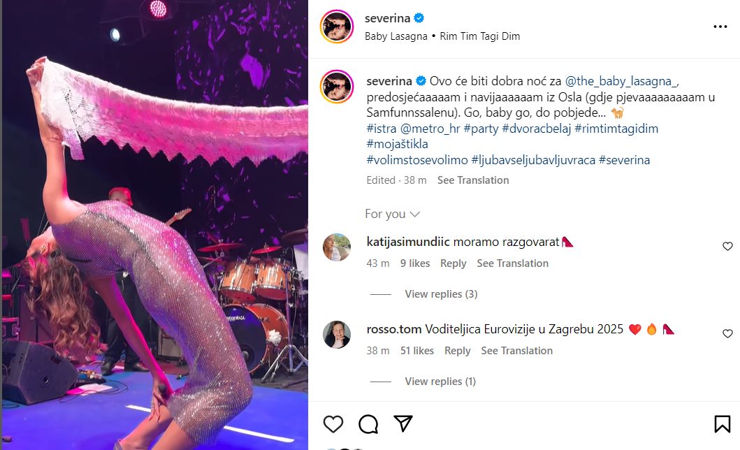 – Ovo će biti dobra noć za @the_baby_lasagna_, predosjećaaaaam i navijaaaaaam iz Osla (gdje pjevaaaaaaaaam u Samfunnssalenu). Go, baby go, do pobjede… 🐈, riječi su Severine koja je nakon pobjede na Dori među prvima pohrlila čestitati mladom kolegi.