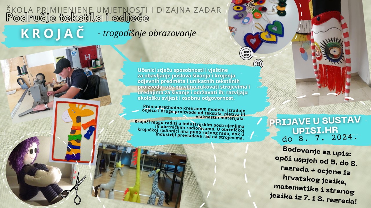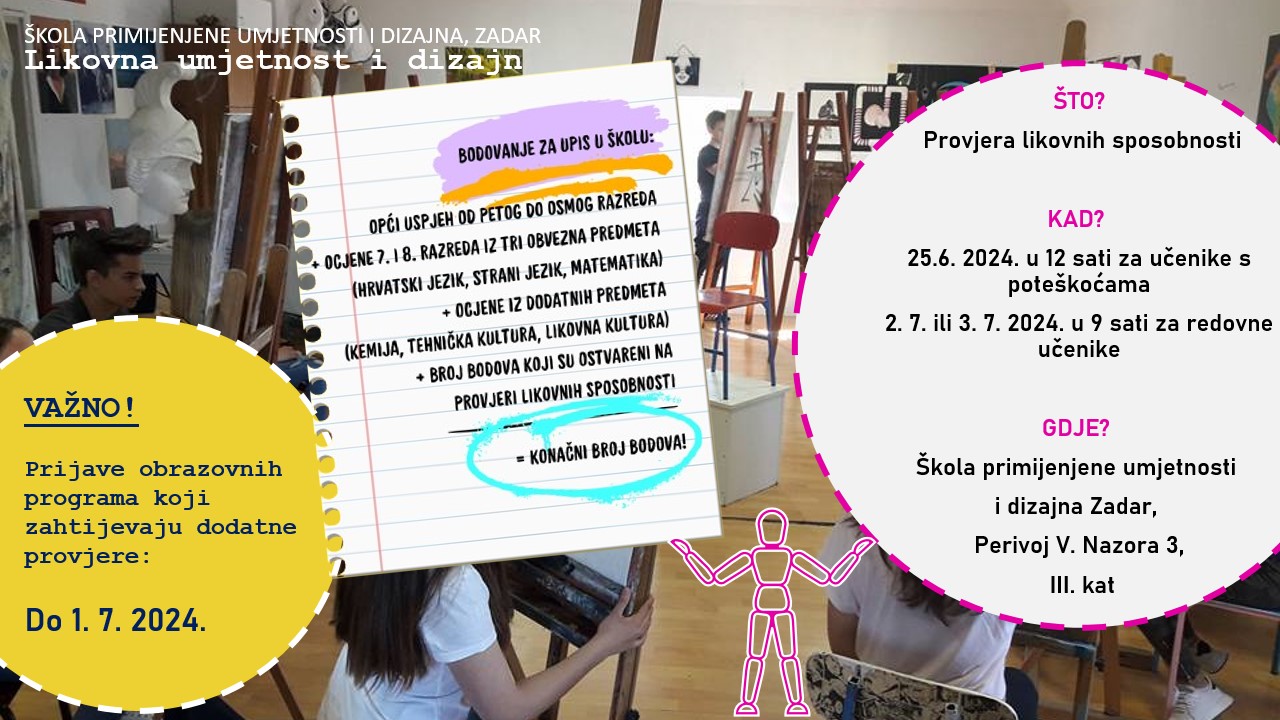 U subotu, 8. lipnja 2024. godine, od 9:00 do 11:00 sati, u Školi primijenjene umjetnosti i dizajna održat će se radionica namijenjena osmašima. Ova radionica pružit će izvrsnu pripremu za sve učenike koji planiraju pristupiti provjeri likovnih sposobnosti za upis u prvi razred likovne umjetnosti i dizajna.