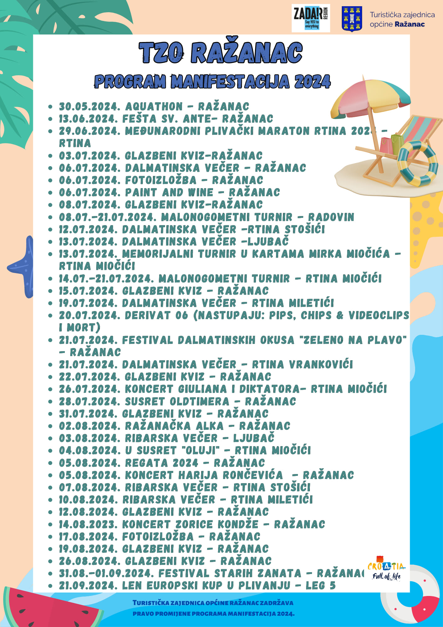 Turistička zajednica općine Ražanac najavila je izmijenjeni program ljetnih manifestacija za 2024. godinu. Program, koji je započeo krajem svibnja, uključuje niz kulturnih, sportskih i zabavnih događanja.