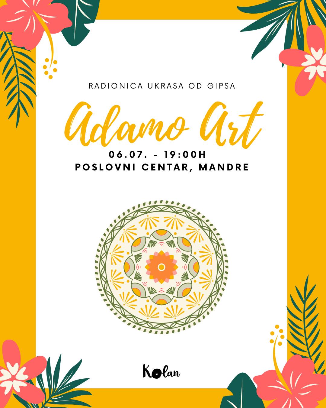 U poslovnom centru u Mandrama, 6. srpnja 2024. godine s početkom u 19:00 sati, održat će se radionica izrade ukrasa od gipsa pod nazivom “Adamo Art”. Ova kreativna radionica namijenjena je svim uzrastima, a sudionicima će pružiti priliku da se okušaju u izradi unikatnih ukrasa.