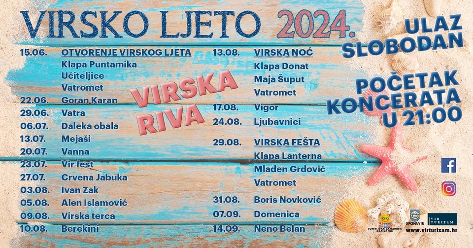 Turistička zajednica Općine Vir i Općina Vir otkrili su bogat i raznovrstan program ovogodišnjeg Virskog ljeta koje će okupiti neka od najvećih imena domaće glazbene scene. Svi koncerti će se održati na virskoj rivi, odnosno Trgu svetoga Jure, s početkom u 21 sat, a ulaz je slobodan za sve posjetitelje.