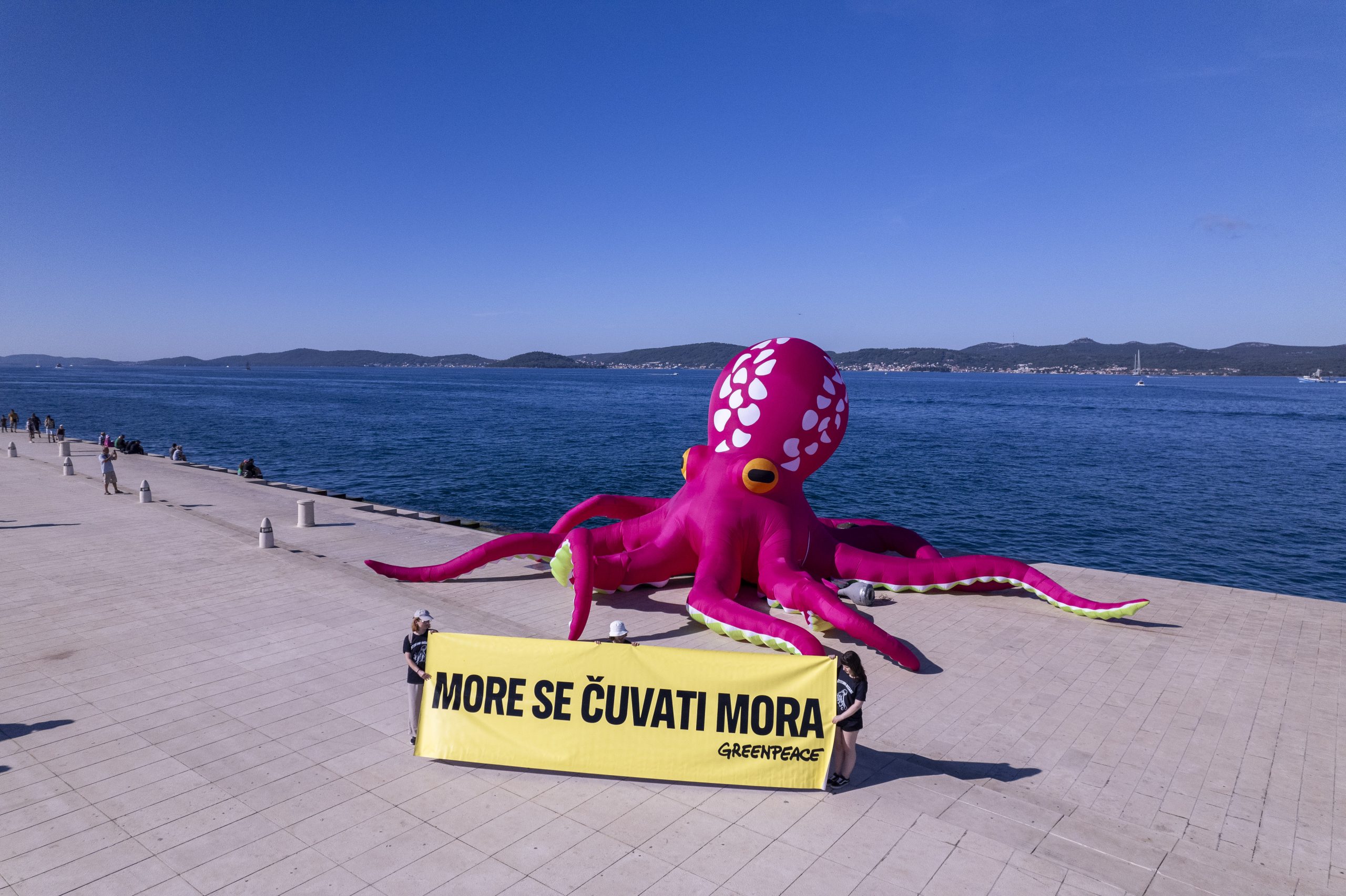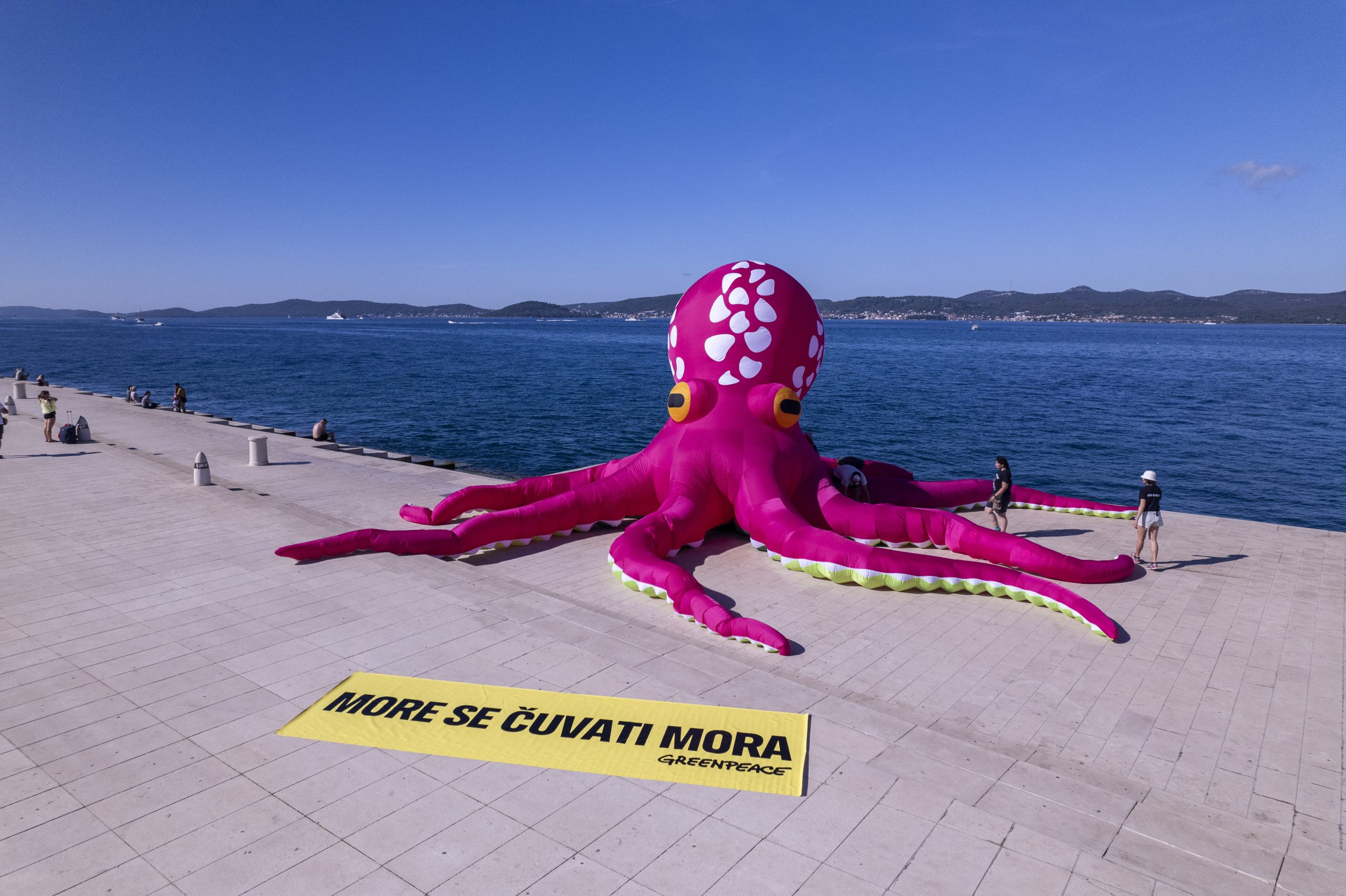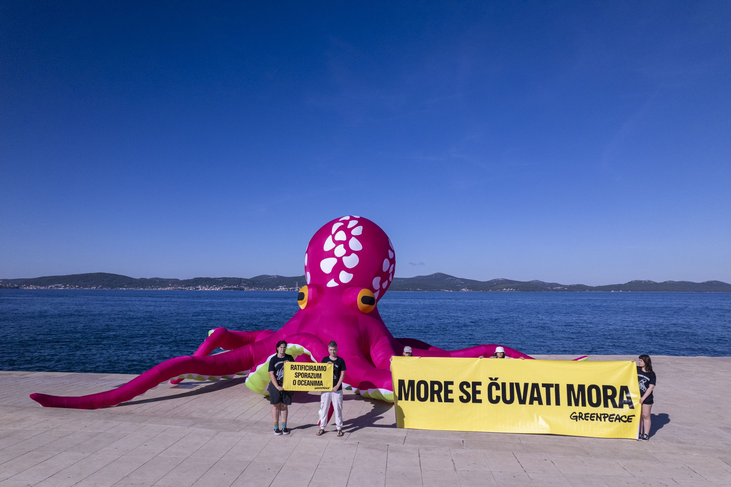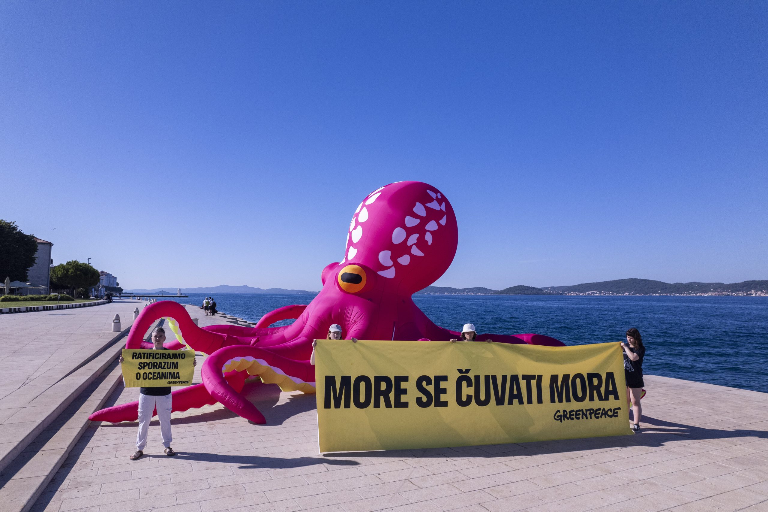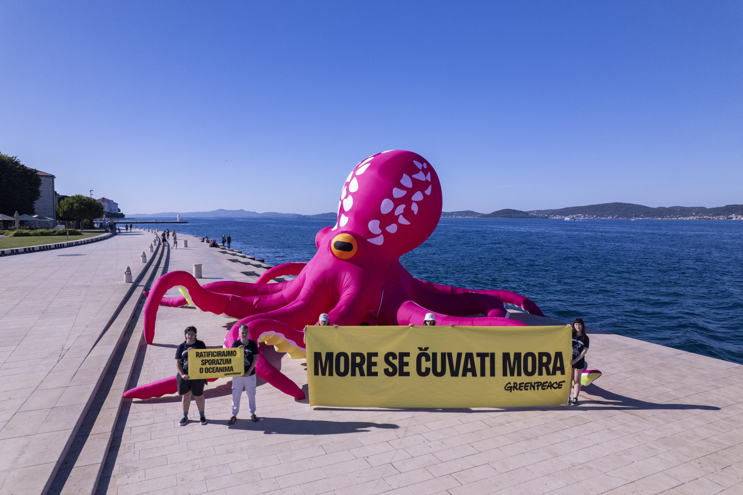 Aktivisti Greenpeacea u petak su na svjetski poznatim Morskim orguljama u Zadru postavili desetmetarsku instalaciju hobotnice, s porukom “More se čuvati mora”, kao apel hrvatskoj Vladi i Saboru za što bržom ratifikacijom globalnog Sporazuma o svjetskim morima. Hrvatska je Sporazum potpisala u rujnu 2023. godine, čime se opredijelila za ispunjenje njegovog glavnog cilja, a to je uspostava globalne mreže zaštićenih morskih rezervata, što bi dovelo do zaštite najmanje 30 posto svjetskih mora do 2030. godine.