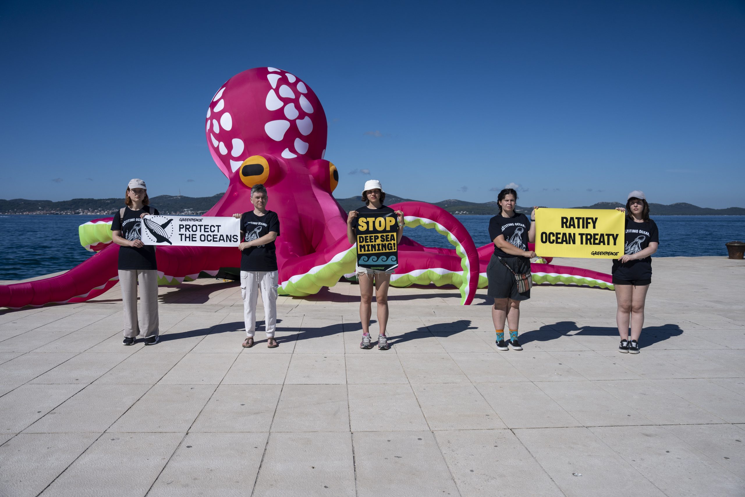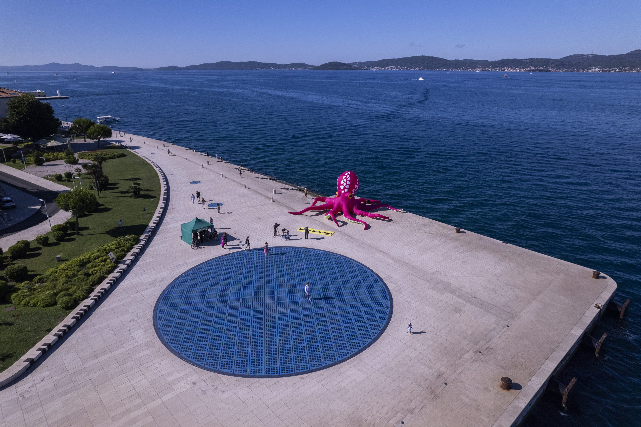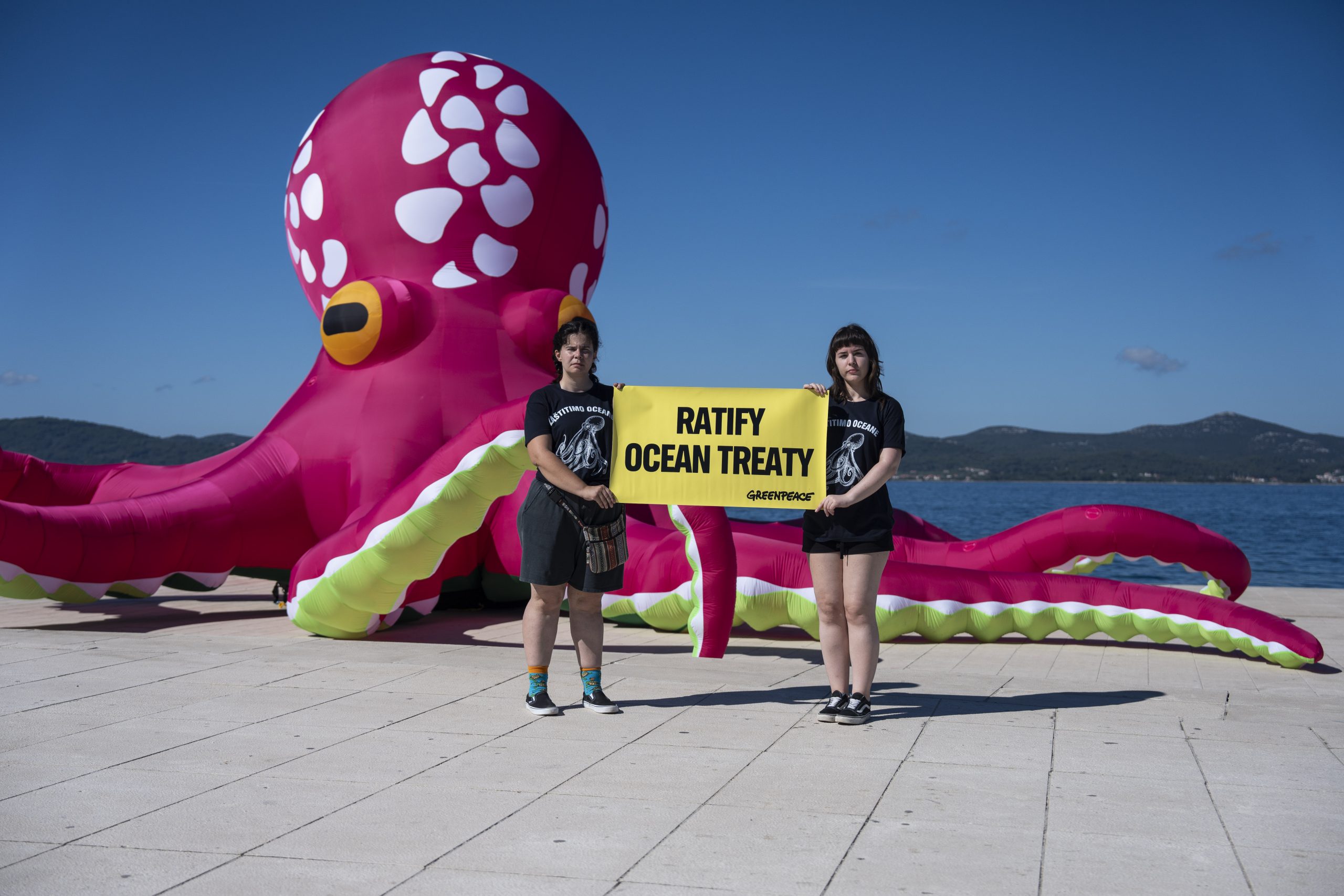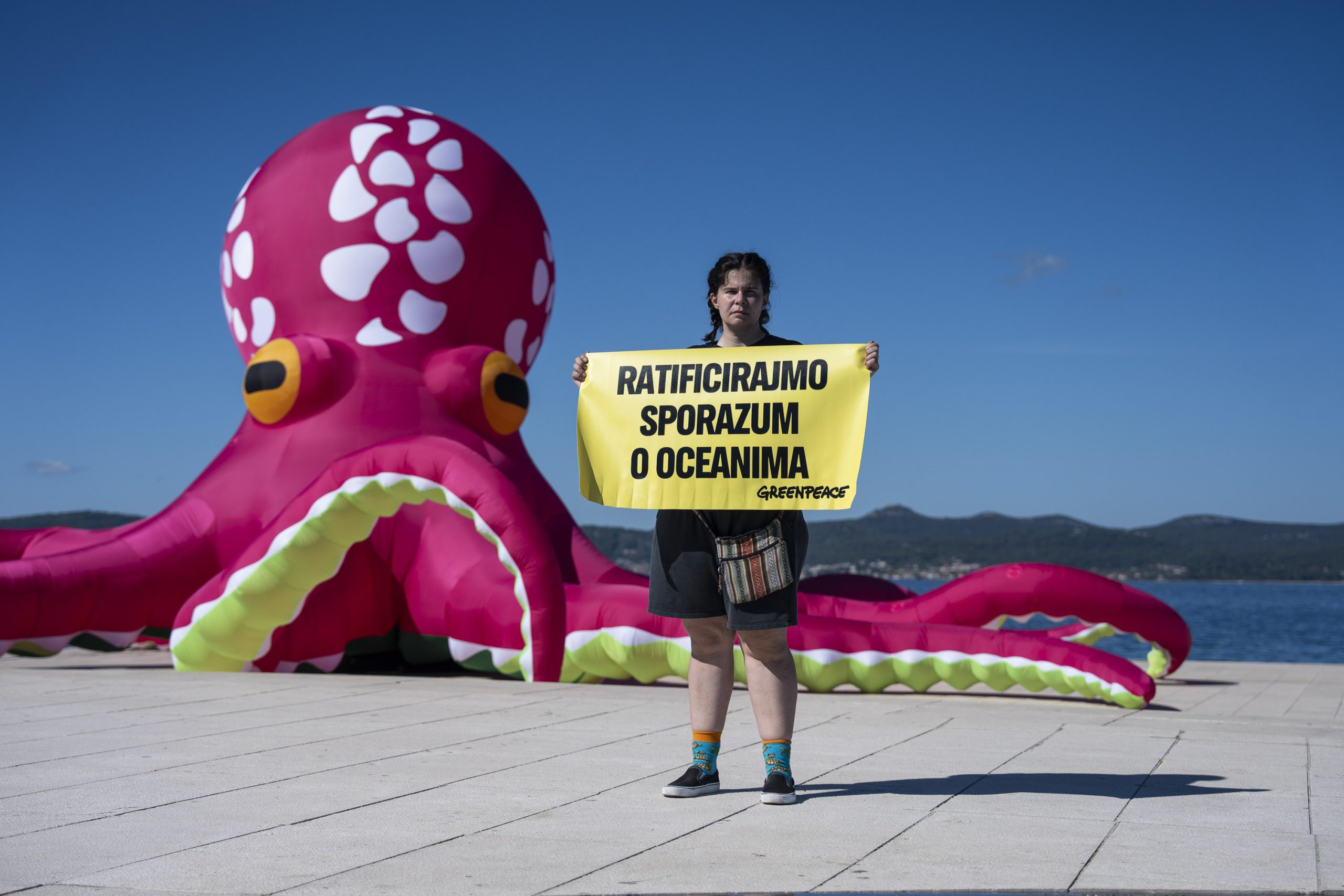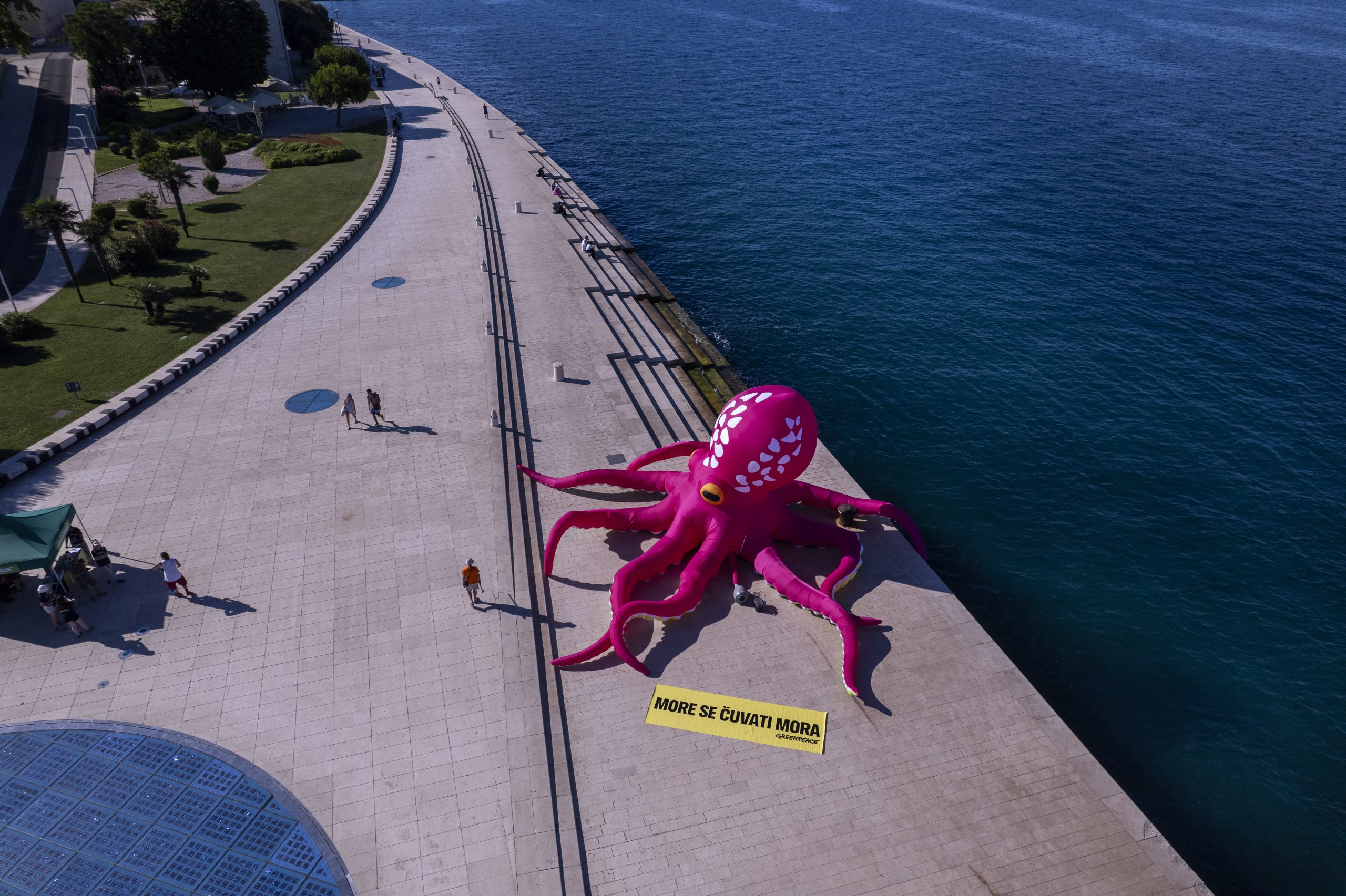 Aktivisti Greenpeacea u petak su na svjetski poznatim Morskim orguljama u Zadru postavili desetmetarsku instalaciju hobotnice, s porukom “More se čuvati mora”, kao apel hrvatskoj Vladi i Saboru za što bržom ratifikacijom globalnog Sporazuma o svjetskim morima. Hrvatska je Sporazum potpisala u rujnu 2023. godine, čime se opredijelila za ispunjenje njegovog glavnog cilja, a to je uspostava globalne mreže zaštićenih morskih rezervata, što bi dovelo do zaštite najmanje 30 posto svjetskih mora do 2030. godine.