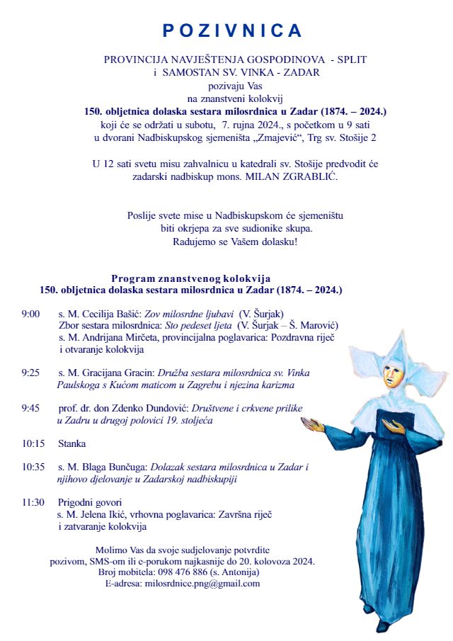 Kolokvij organiziraju Provincija Navještenja Gospodinova – Split i samostan sv. Vinka Zadar. Ovaj događaj okupit će brojne sudionike i predavače, koji će kroz svoja izlaganja osvrnuti na bogatu povijest i značaj sestara milosrdnica u Zadarskoj nadbiskupiji.