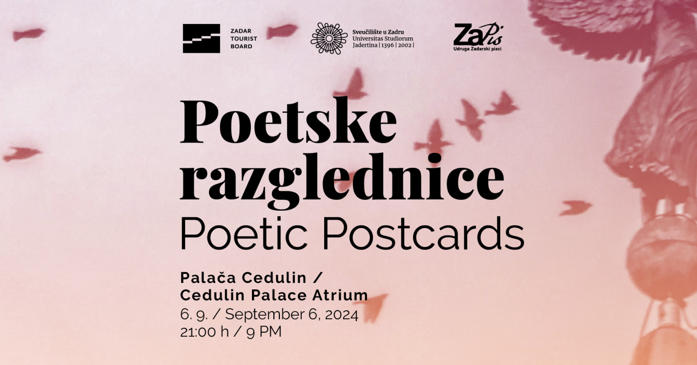 U organizaciji Udruge zadarskih pisaca ZaPis i Turističke zajednice grada Zadra, 6. rujna 2024. u 21:00 sat, Palača Cedulin postat će središte poezije i umjetničkog izraza. Naime, u atriju Palače održat će se jedinstveni događaj pod nazivom “Poetske razglednice”, na kojem će zadarski pjesnici kroz svoje stihove i izričaj pružiti publici priliku da se upoznaju s ljepotom riječi i snage poezije.