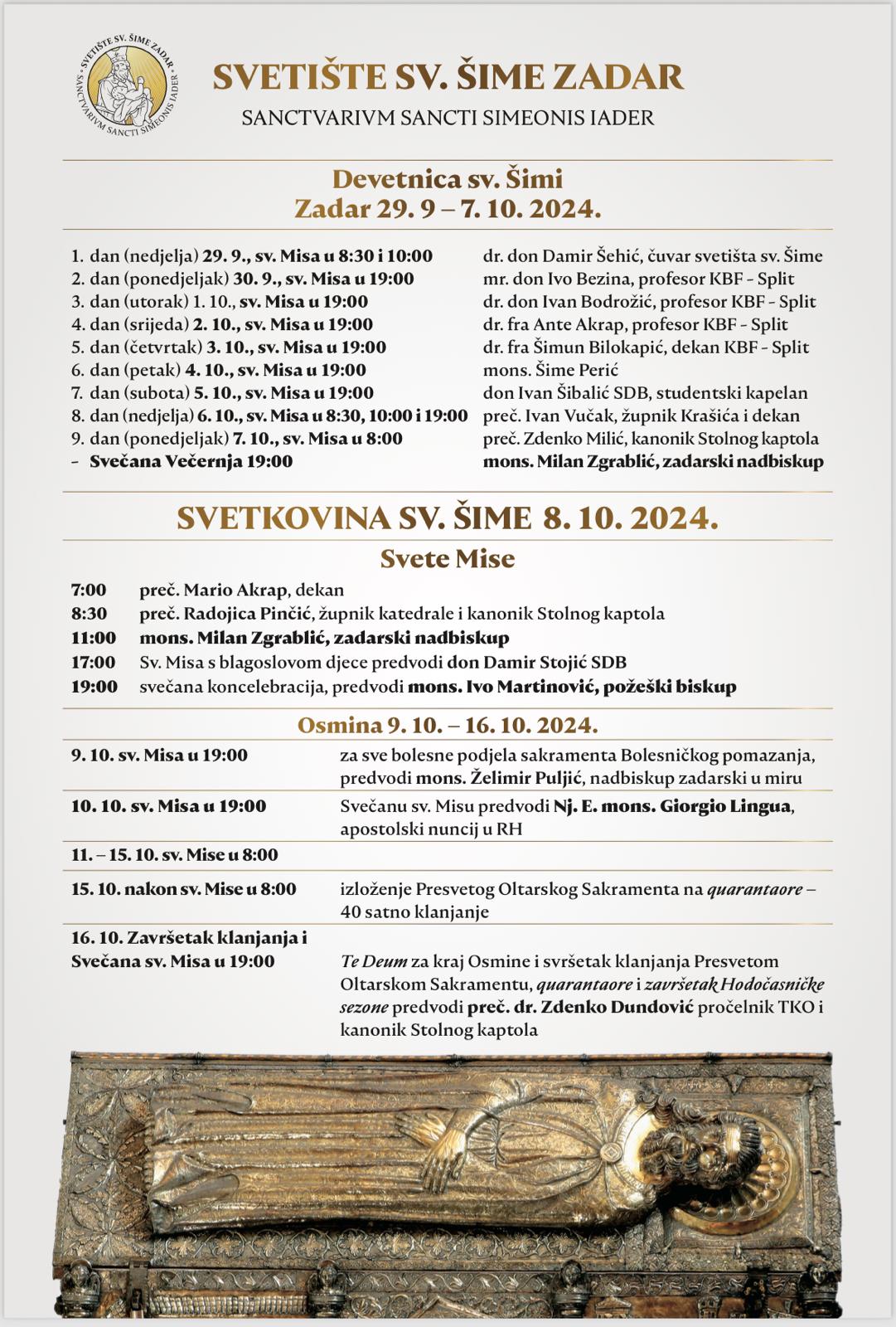 Zadnji dan Devetnice, u nedjelju, 6. listopada, misno slavlje predvodi vlč. Ivan Vučak, župnik Krašića. Uoči blagdana, 7. listopada, svečanu Večernju predvodi zadarski nadbiskup Milan Zgrablić. Na sam blagdan sv. Šime, 8. listopada, svečano prijepodnevno misno slavlje u 11:00 sati i večernje slavlje u 19:00 sati predvode zadarski nadbiskup i požeški biskup Ivo Martinović.
