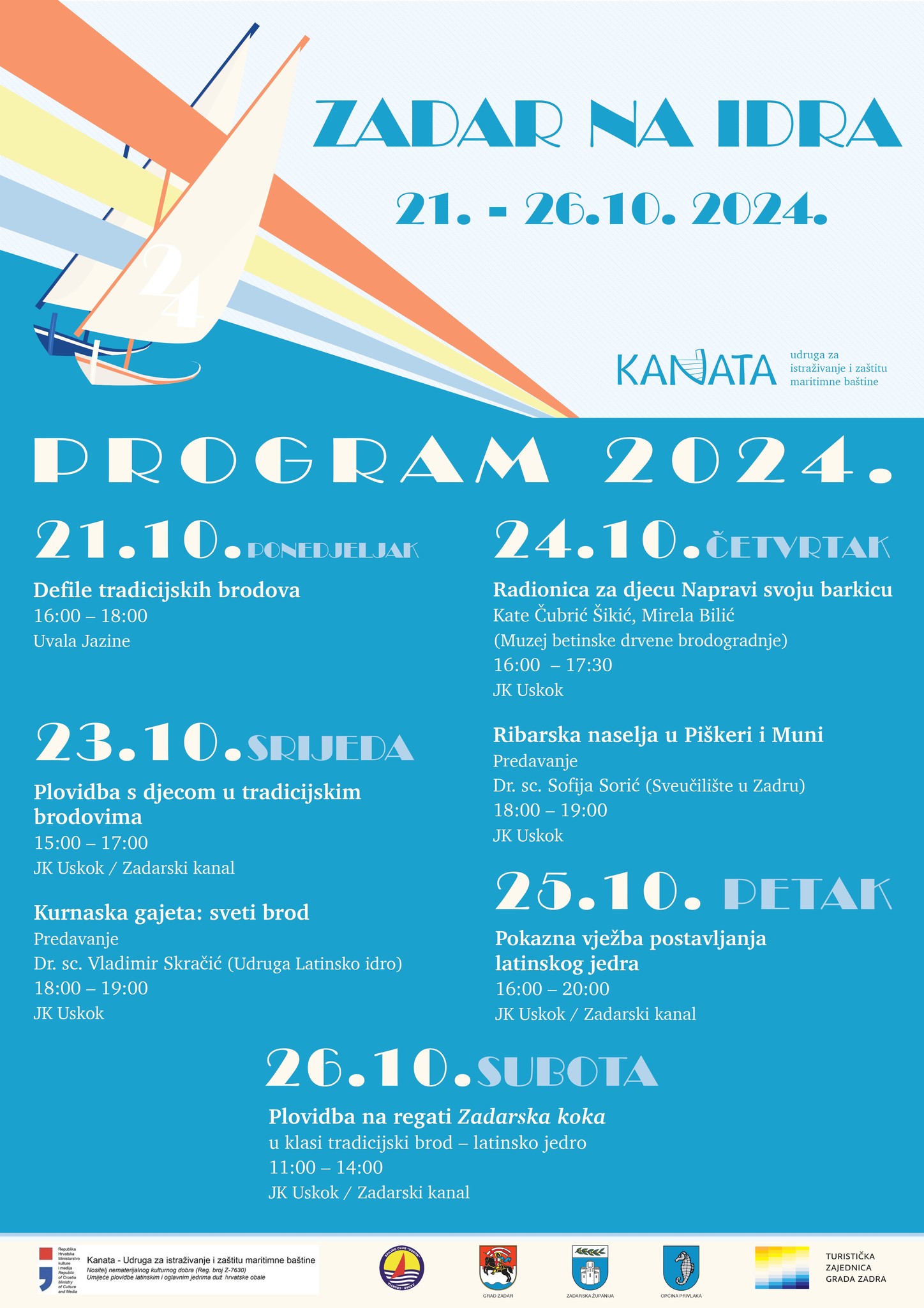 Udruga za istraživanje i zaštitu maritimne baštine Kanata najavljuje treću po redu manifestaciju “Zadar na idra”, koja će se održati od 21. do 26. listopada 2024. godine. Ova manifestacija posvećena je očuvanju tradicijskog plovidbenog naslijeđa, posebice umijeća plovidbe latinskim jedrom, koje je simbol zadarskog pomorstva. Program manifestacije uključuje brojne aktivnosti za sve uzraste, od radionica za djecu do plovidbi tradicionalnim drvenim brodovima s latinskim jedrima.