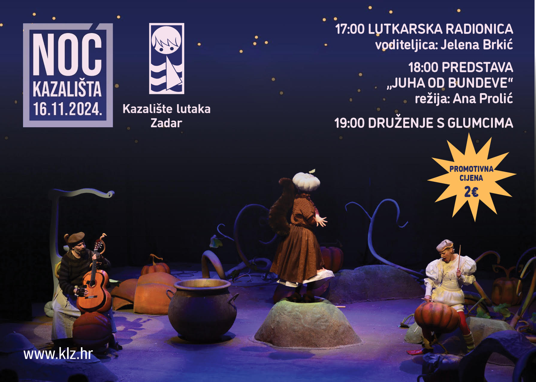Kazalište lutaka Zadar priprema jedinstven program u sklopu tradicionalne Noći kazališta. U ovoj posebnoj večeri publiku očekuje niz aktivnosti prilagođenih svim uzrastima. Program započinje lutkarskom radionicom koju vodi Jelena Brkić, osmišljenu za najmlađe zaljubljenike u kazalište. Nakon radionice slijedi predstava “Juha od bundeve” u režiji Ane Prolić, koja će zasigurno oduševiti gledatelje svojim duhovitim i maštovitim pristupom.