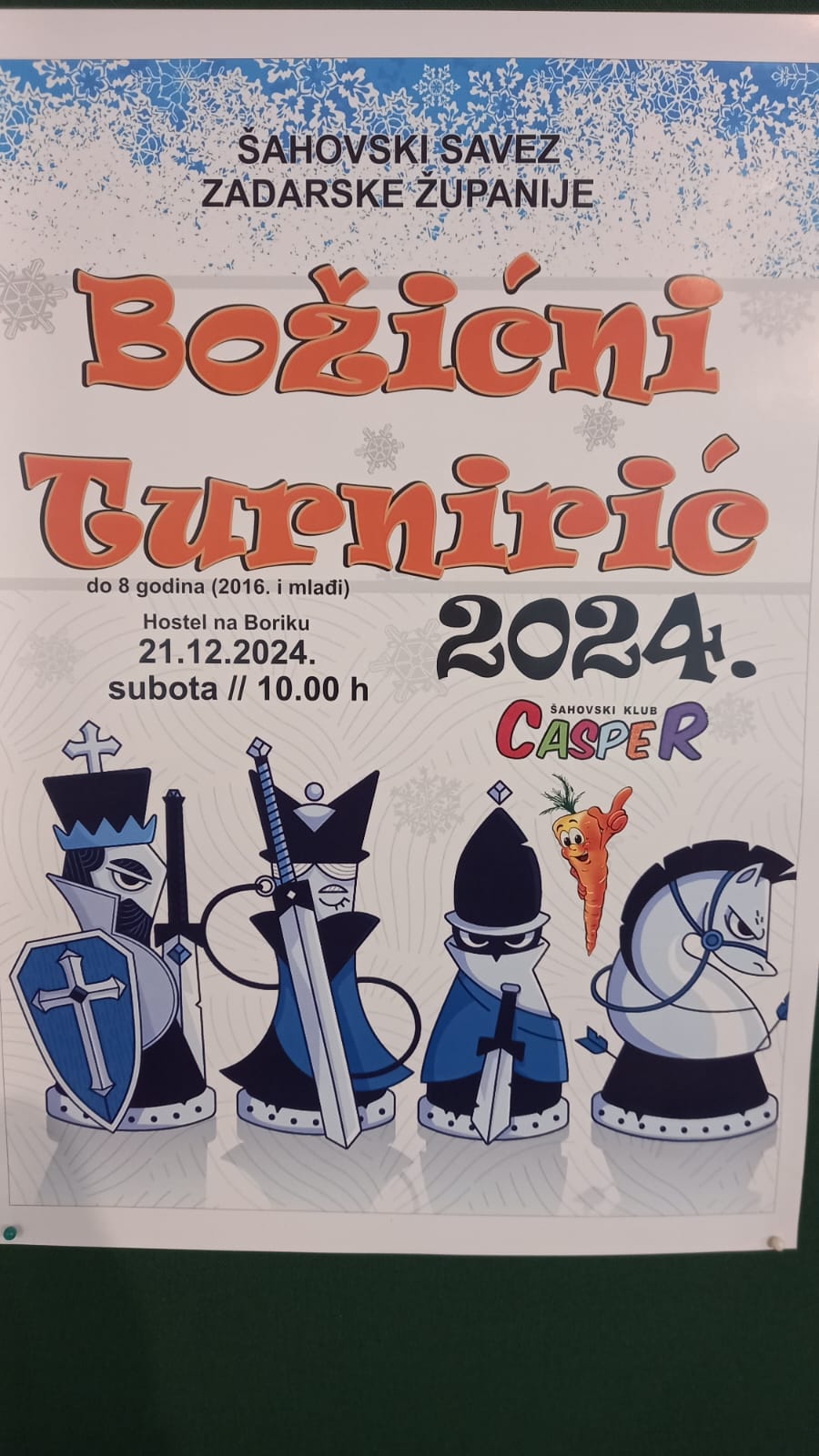Šahovski savez Zadarske županije i Šahovski klub Casper organiziraju Božićni turnir za najmlađe uzraste do osam godina. Turnir će se održati u subotu, 21. prosinca 2024. godine, u Hostelu na Boriku s početkom u 10 sati.