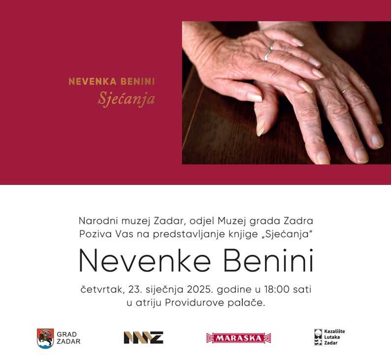 U atriju Providurove palače u Zadru, 23. siječnja 2025. godine s početkom u 18 sati, održat će se predstavljanje knjige Sjećanja Nevenke Benini. Ovaj događaj organizira Narodni muzej Zadar, odjel Muzej grada Zadra, u znak priznanja dugogodišnjem umjetničkom stvaralaštvu ove istaknute autorice.