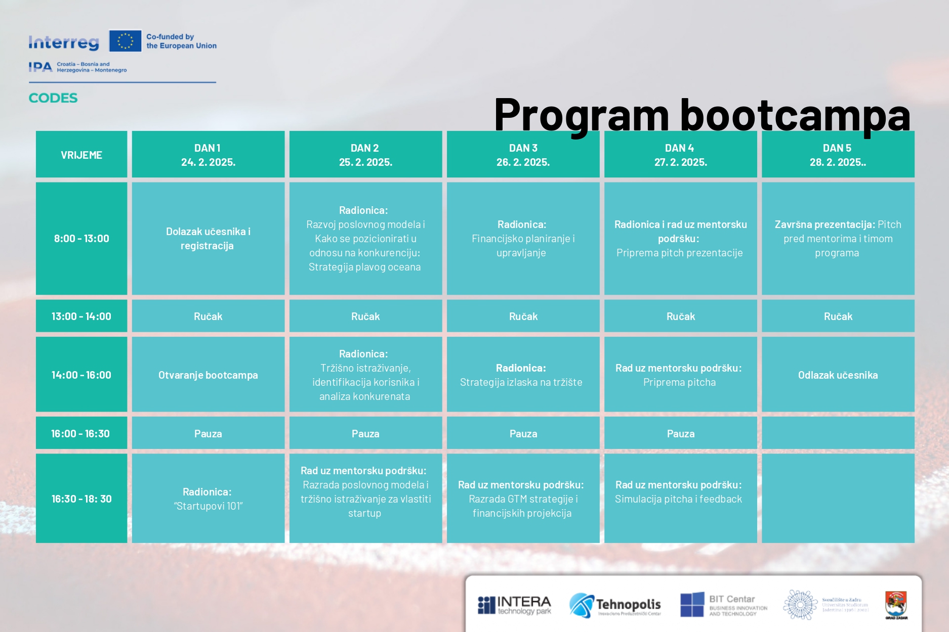 Prijave su otvorene do 13. veljače 2025., a organizator pokriva troškove puta i smještaja za jednog člana tima. Program provode Grad Zadar, Sveučilište u Zadru, INTERA Technology Park iz Mostara, Inovaciono preduzetnički centar Tehnopolis iz Nikšića i BIT Centar Tuzla, a sufinanciran je sredstvima Europske unije kroz Interreg IPA Croatia-Bosnia and Herzegovina-Montenegro 2021. – 2027.