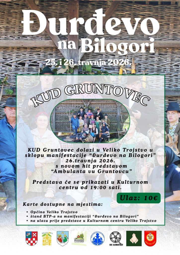 U sklopu manifestacije „Đurđevo na Bilogori”, u nedjelju 26. travnja s početkom u 19 sati u Kulturnom centru održat će se kazališna predstava „Ambulanta vu Gruntovcu” u izvedbi KUD-a Gruntovec iz Sigeca.