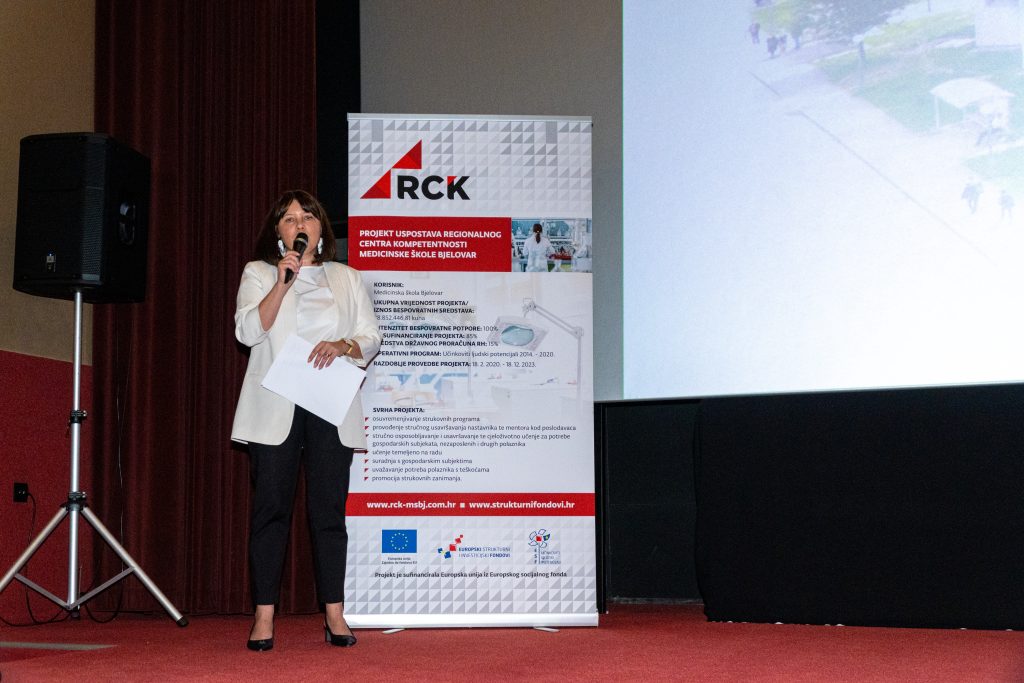 „Projekt dogradnje Regionalnog centra kompetentnosti i projekt Uspostave Regionalnog centra kompetentnosti su ugovoreni u ukupnoj vrijednosti od 62.226.527,32 milijuna kuna odnosno 8.258.879,40 eura, što dovoljno govori o ozbiljnosti ulaganja Bjelovarsko-bilogorske županije u područje obrazovanja. Važno je naglasiti da je na projektu radilo preko 100 zaposlenika, dio od strane 13 partnera, a dio od strane odgojno obrazovnih radnika Medicinske škole Bjelovar. S obzirom da je Bjelovarsko-bilogorska županija osnivač Medicinske škole Bjelovar, međukonferenciji su nazočile i pročelnice Upravnog odjela za društvene djelatnosti i obrazovanje gđa. Andrea Prugovečki Klepac i pročelnica Upravnog odjela za zdravstvo, demografiju i mlade, gđa. Andrea Bengez. Tijekom cijelog trajanja oba Projekta, dogradnje i uspostave Regionalnog centra, navedeni upravni odjeli su zajednički sudjelovali u provedbi te je cilj tim putem i dalje nastaviti“, izjavila je voditeljica projekta Uspostave Regionalnog centra kompetentnosti Medicinske škole Bjelovar, Julija Jambreković Polančec, BBŽ.