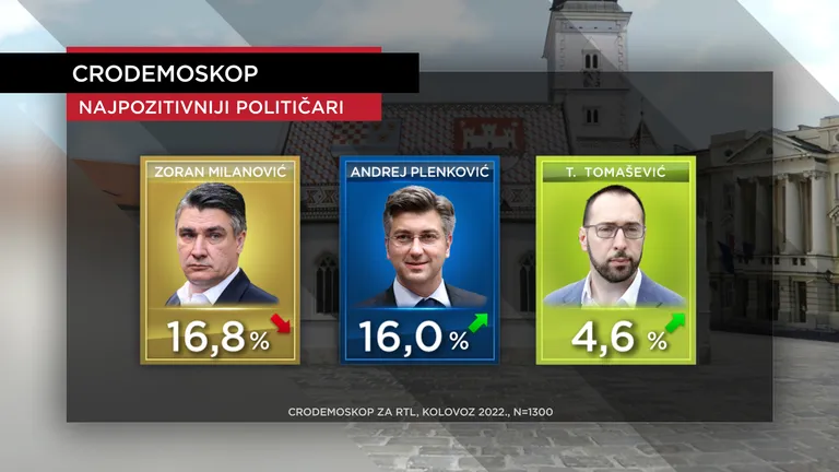 Promjena u vrhu najpopularnijih političara – nema. Predsjednik Milanović (kolovoz 16,8 posto – srpanj 16,9 posto – rekordnih 23,7 posto iz studenog prošle godine) od ožujka prošle godine je na vrhu, ali mu se premijer Plenković (kolovoz 16 posto – srpanj 15,8 posto) približio na niti jedan postotni poen, što je najmanja razlika od srpnja prošle godine.