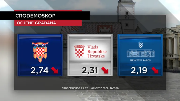 Takve su i vaše ocjene političkih institucija. Jedino Uredu predsjednika i dalje dajete mršavu trojku (kolovoz 2,74 – srpanj 2,79 ). Što je nova najniža ocjena za doživljaj rada predsjednika Republike od početka njegova mandata. Dok rad Vlade ( kolovoz 2,31 – srpanj 2,32), kao i Sabora (kolovoz 2,19 – srpanj 2,20) koji sad ni ne radi, ocjenjujete sa: sjedi dva.