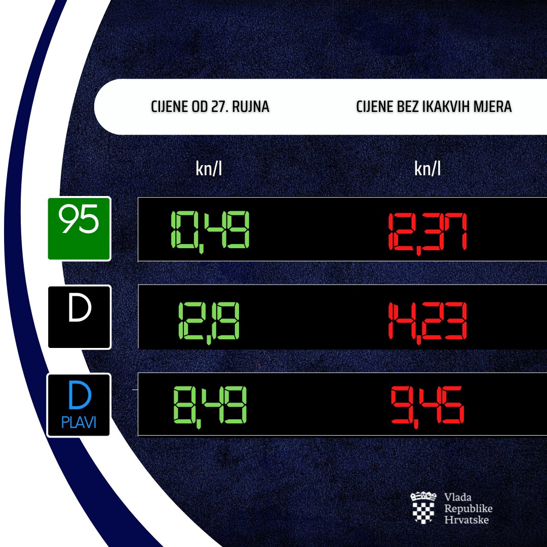 Litra benzina tako će od sutra koštati 10,49 kuna, a litra diesela 12,19 kuna. Plavi diesel koštat će 8,49 kuna.