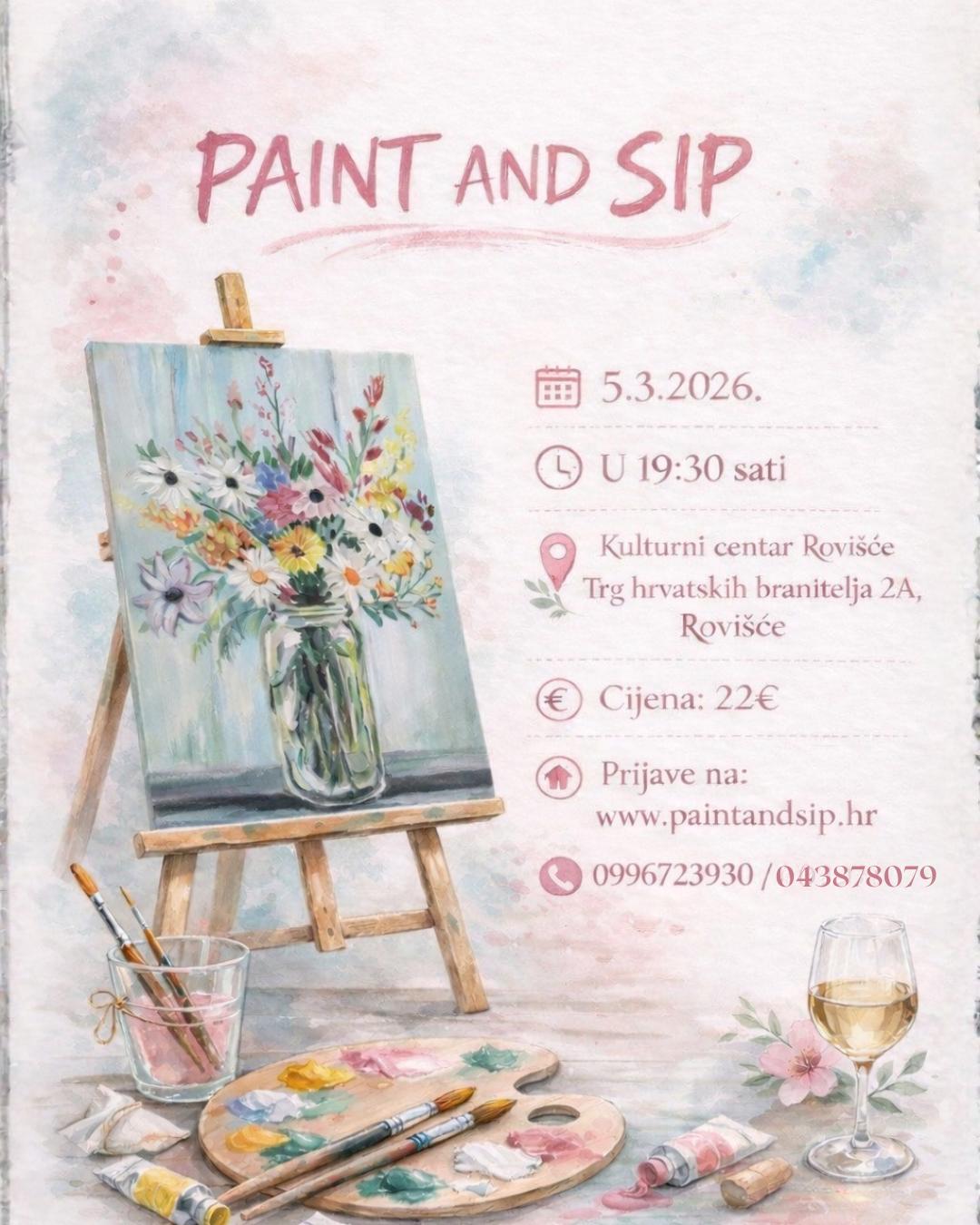 Pred mještanima Rovišća je večer opuštanja, umjetnosti i zabave. Tamo se u četvrtak, 05. ožujka, od 19 i 30 održava Paint&Sip, radionica koja spaja slikanje i uživanje u čaši vina u ugodnoj i poticajnoj atmosferi. Radionica će se održati u prostoru Kulturnog centra Rovišće gdje će sudionici, uz stručno vodstvo, korak po korak stvarati motiv proljetnog buketa.